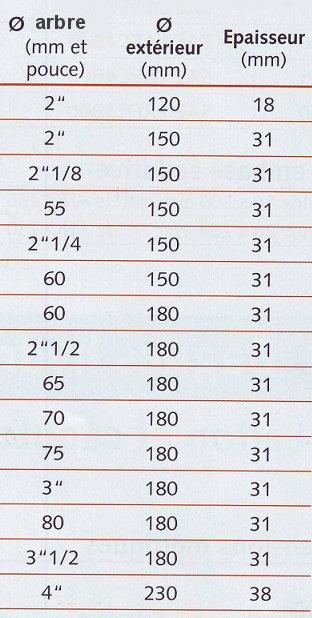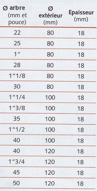 Sur les 2 tableaux ci-dessus diamètre d'arbre en mm et en pouce , diamètre extérieur et épaisseur .